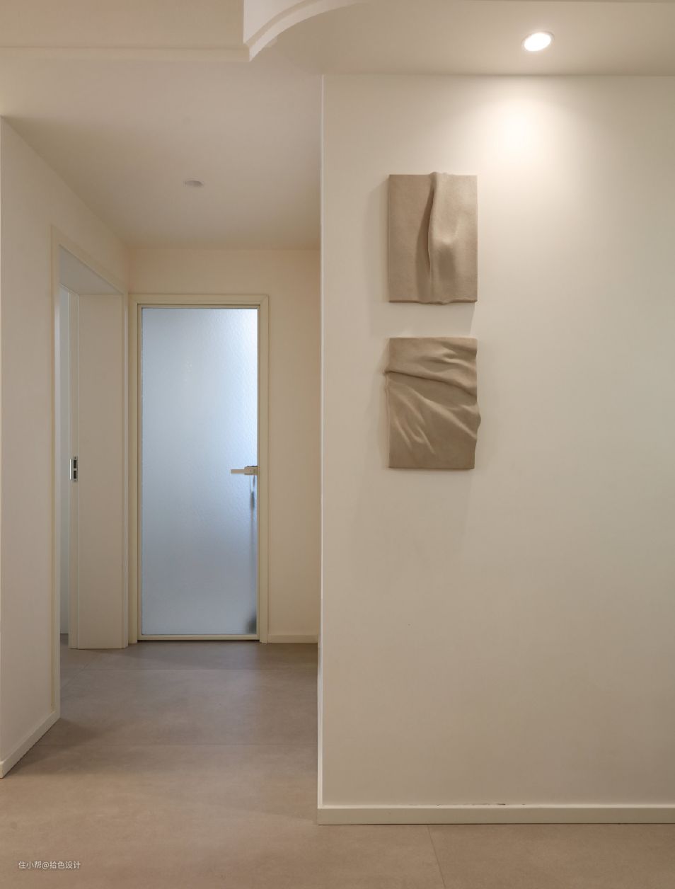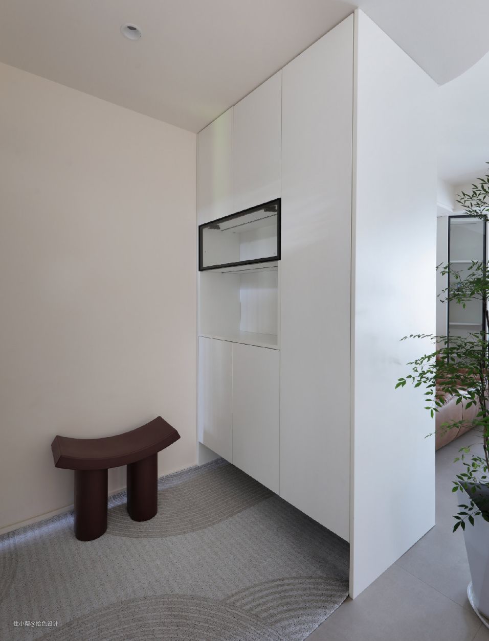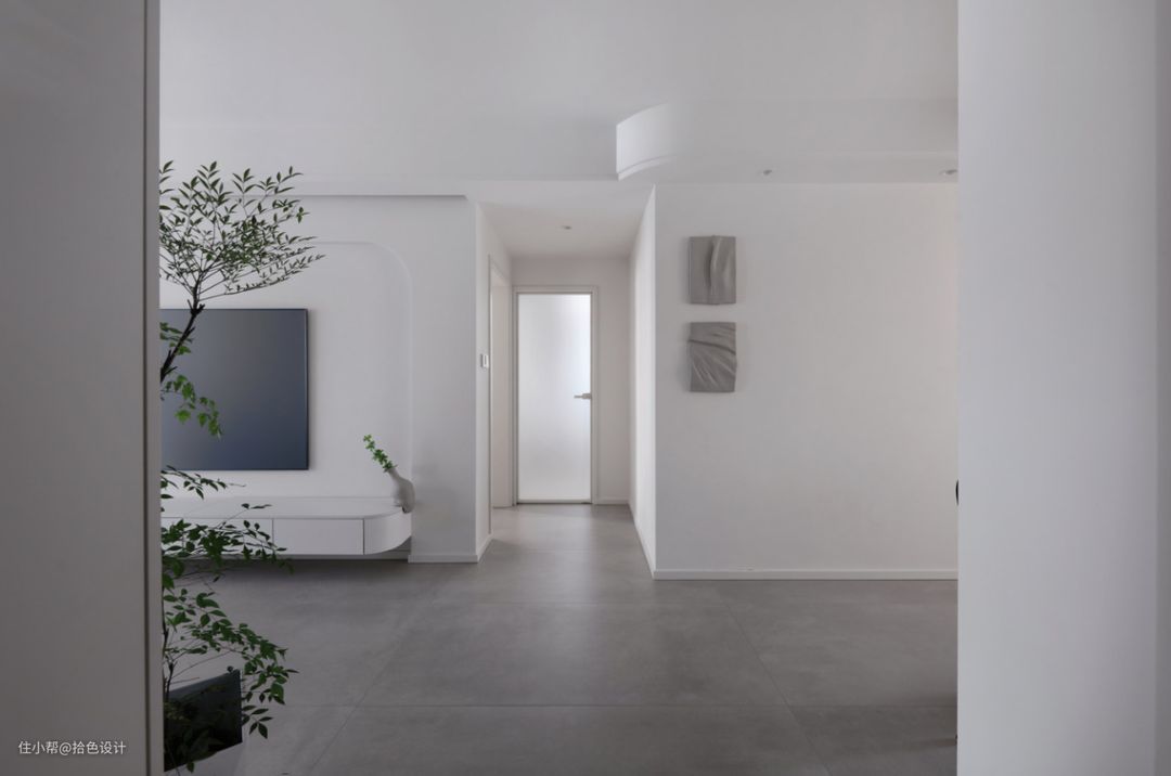 玄关看向室内视角,浅灰色的哑光面地砖,留白的墙面,极简的线条元素,以及若隐若现的绿植增加,无不透着简洁纯粹的腔调,且带来了一种不可触碰的美。
