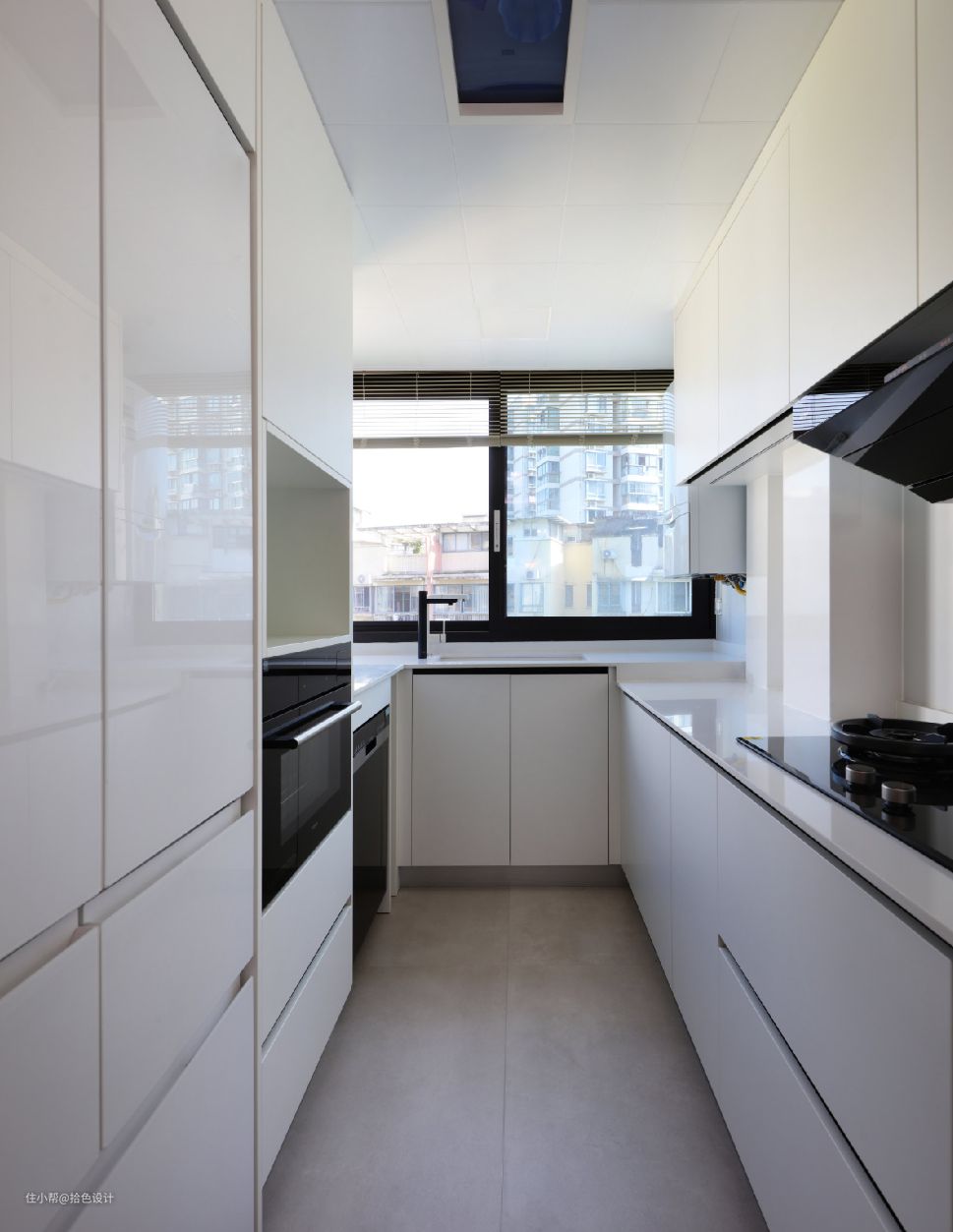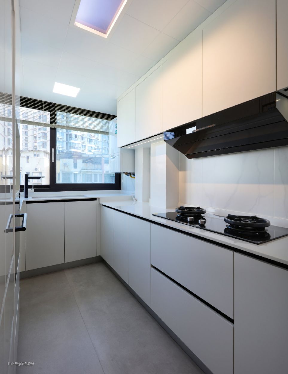 厨房做了U型橱柜+嵌入式冰箱布局,充分遵循了极简主题,并有了更加流畅的操作动线。而统一的白色调定位,也间接性起到了放大空间感的作用,继而规避了压抑性。