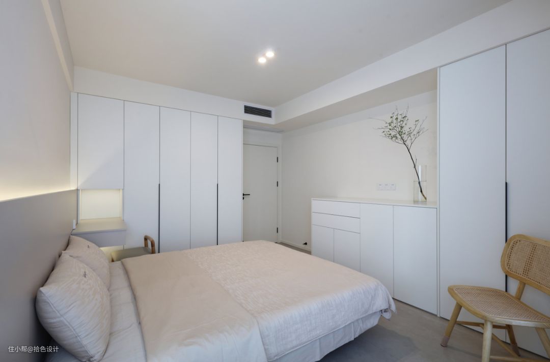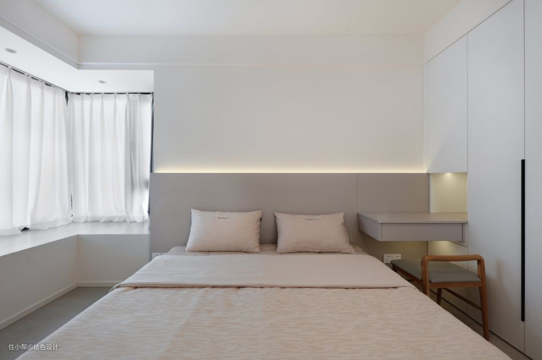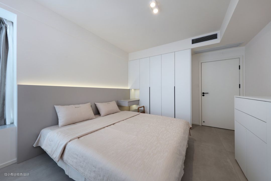 相较于客厅纯粹的白调,主卧墙面刷上暖白色涂料,再搭配上低饱和度的软装,目光所及皆是温柔,且让人有了一种甜而不腻的感受。