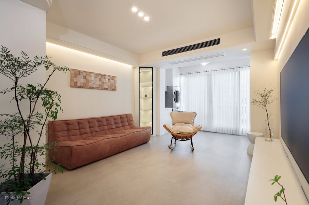 沙发墙最大的亮点,就是墙角处设计了一组拐柜。不仅为空间打造出了一块天然展示区,也一定程度上弱化了客厅与阳台的边界感。而一张皮面的咖色模块沙发选择,也赋予了生活更加自由的形态,且增强了空间的层次感。