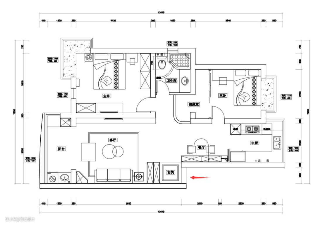 2、次卧门洞改从餐厅进入,并结合原过道面积规划出一个储物间。