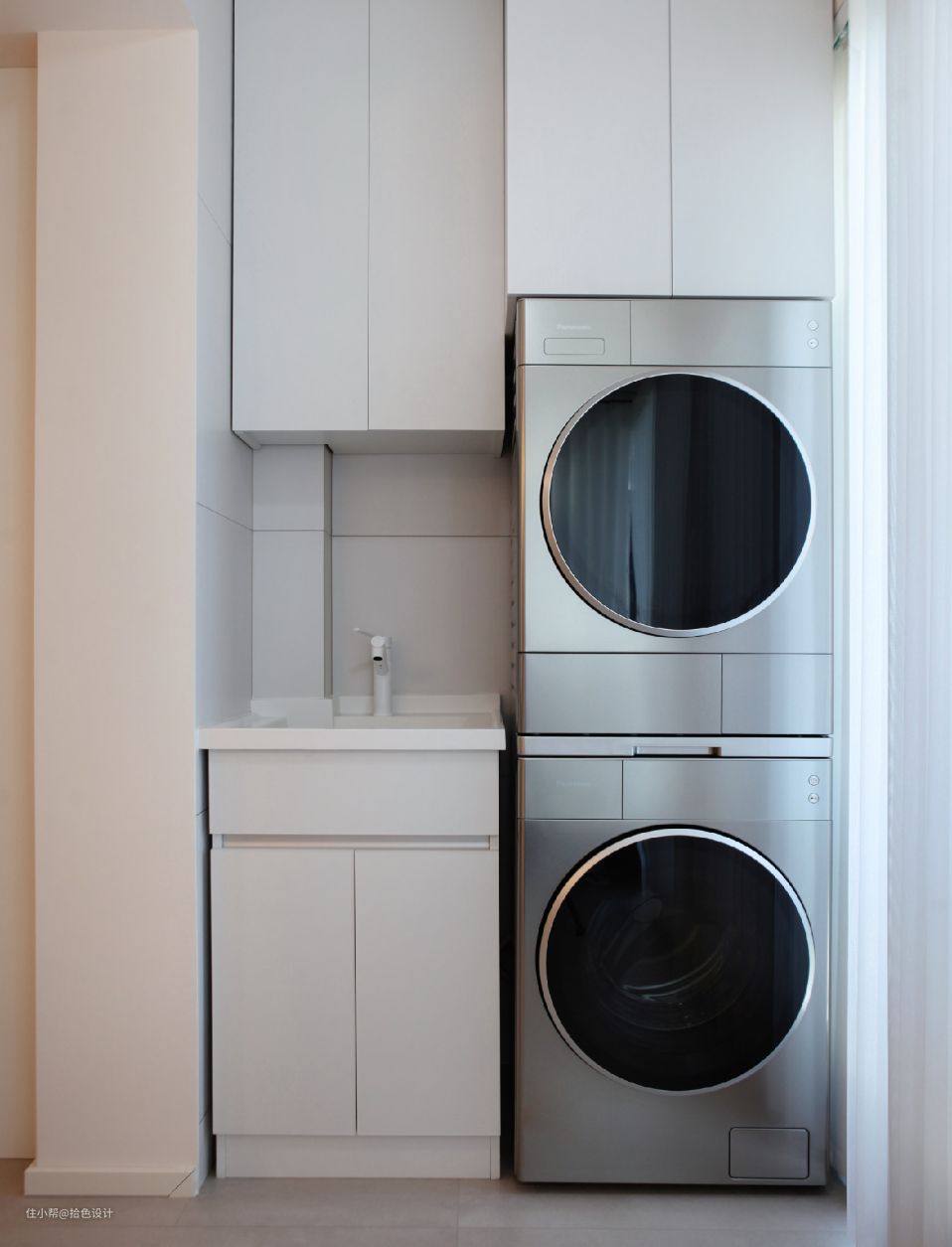 阳台一侧增加了一体化的家政区设计,让居家更有幸福感。同时,灰空铝饰面的洗烘机饰面,也彰显出了屋主对单品的重视,看起来相当有质感。