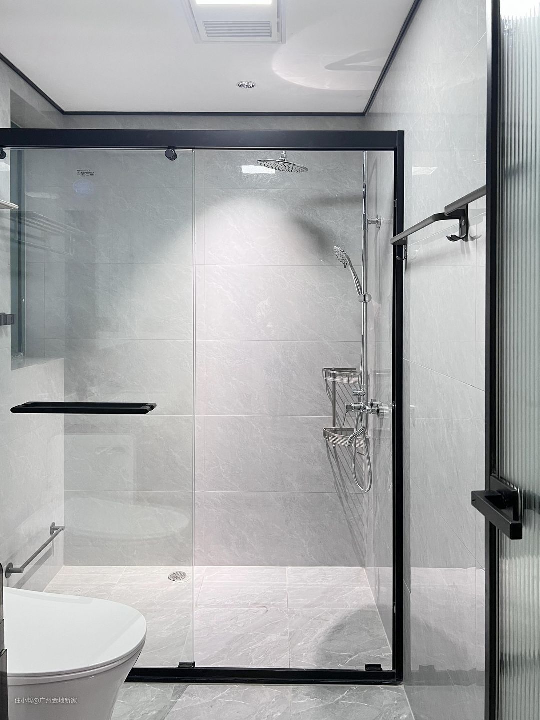卫生间进行了简单的干湿分离,用长虹玻璃推拉门隔断淋浴间,两面大镜柜、悬浮洗手柜与墙壁上的毛巾架完美满足一家人对洗漱用品的收纳需求。