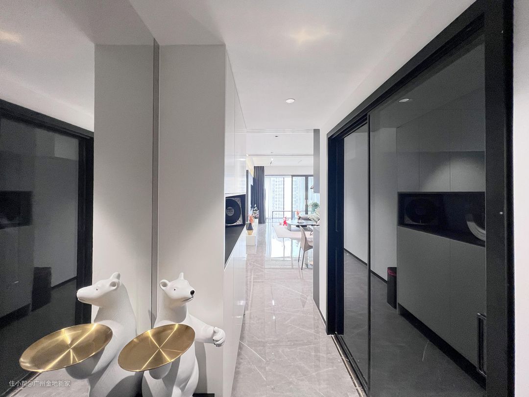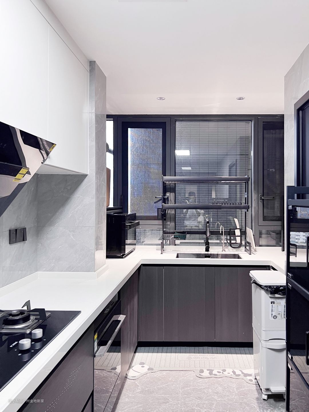 玄关右侧就是厨房,两扇黑色玻璃推拉门作为隔断。黑白灰是厨房的主色调,经典的颜色高级而不单一。