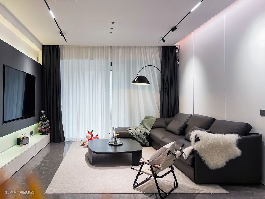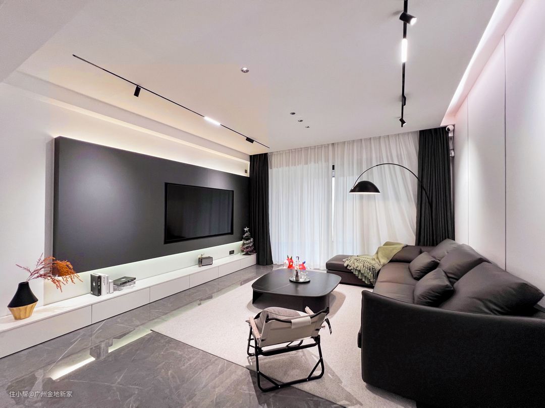改造之后整体简约大方,轨道灯与线性灯大大改善了光线条件,黑白灰的搭配充满高级感,电视墙充满层次感,下方的地柜也增加了收纳力。