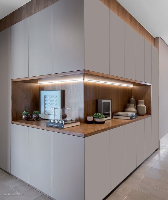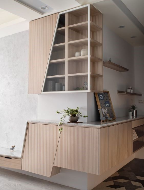 相对比较常见,将转角适当留空,要么连着一体,要么单独安置,哪怕仅是一个吊灯加上一个盆栽,也能显得更加清爽,而不是全是收纳。