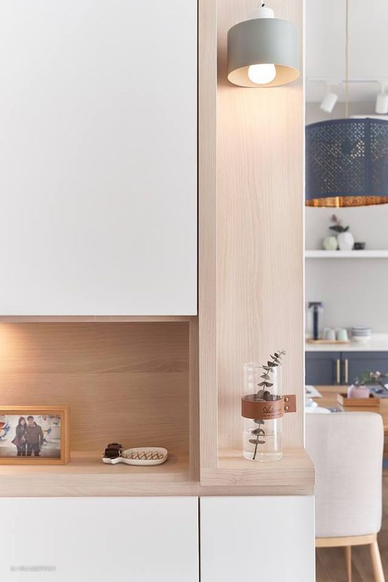 柜子中间适当留空,加上一层隔板置物,均能满足不同区域的使用需求,一些常用的杯具或小家电也能妥善安置,但要注意下,提前预留好插座的位置哟。