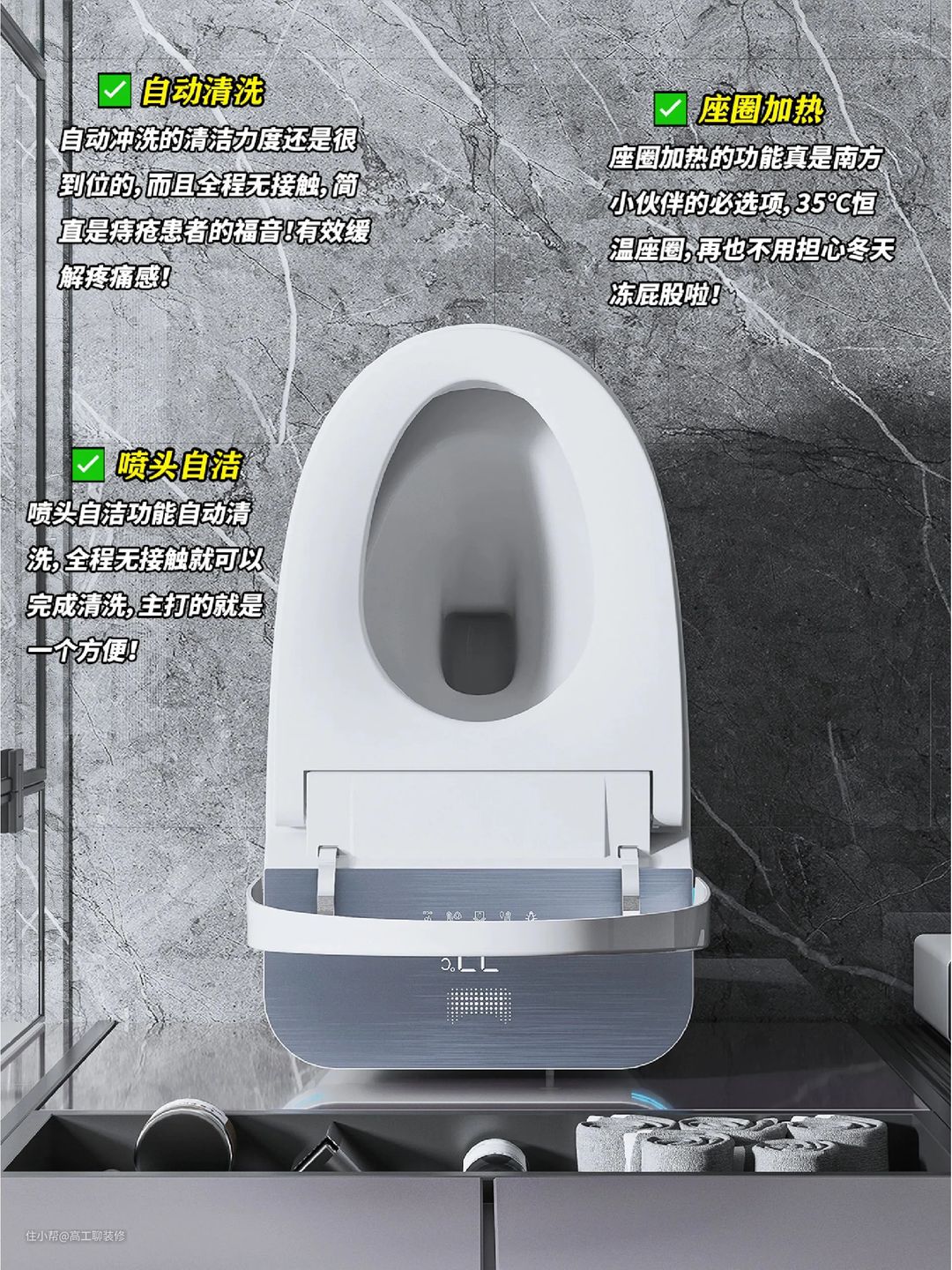 记得小时候生活在农村,因为条件有限,那个时候全家人方便时,使用蹲坑,但是现在自从步入了城市,受周围环境的影响,自己家新房装修的时候,卫生间的马桶执意要安装上智能的,主要是因为智能马桶的多功能,吸引到我了,座圈加热、IPX4防水等级、活水即热、喷杆自洁、虹吸式冲刷、停电冲水、漏电保护、静音缓降盖板、臀洗妇洗、自动翻盖、离座自动冲水、自动除臭等多种功能,真的很诱惑。