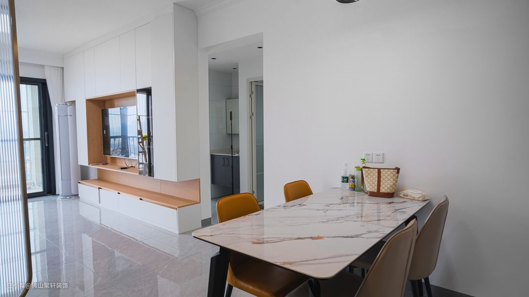 餐厅未做隔断,灰调大理石餐桌搭配橘黄色软餐椅,跳色打造层次感的同时,体现空间包容人情味十足的氛围。