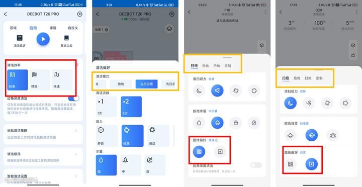 此外,3款扫地机器人也都能进行快速清扫和精细清扫的选择。科沃斯T20有标准、精细、快速3种模式,而石头P10和G20也有快速和日常两种模式可选。在清洁顺序方面,科沃斯T20可以定制边扫边拖、纯扫、纯拖、先扫后拖4种模式,而石头的P10和G20只有扫拖、纯扫、纯拖3种模式可选。