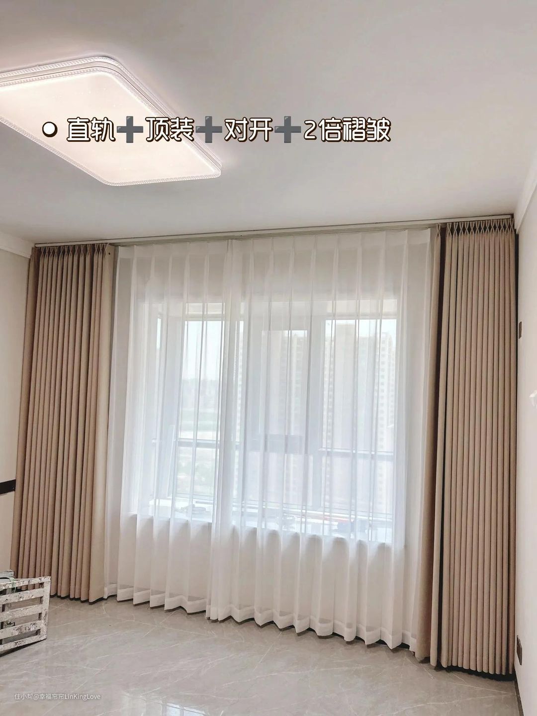 直轨+顶装+对开+两倍褶皱,明装式轨道与吊顶在同一平面上。