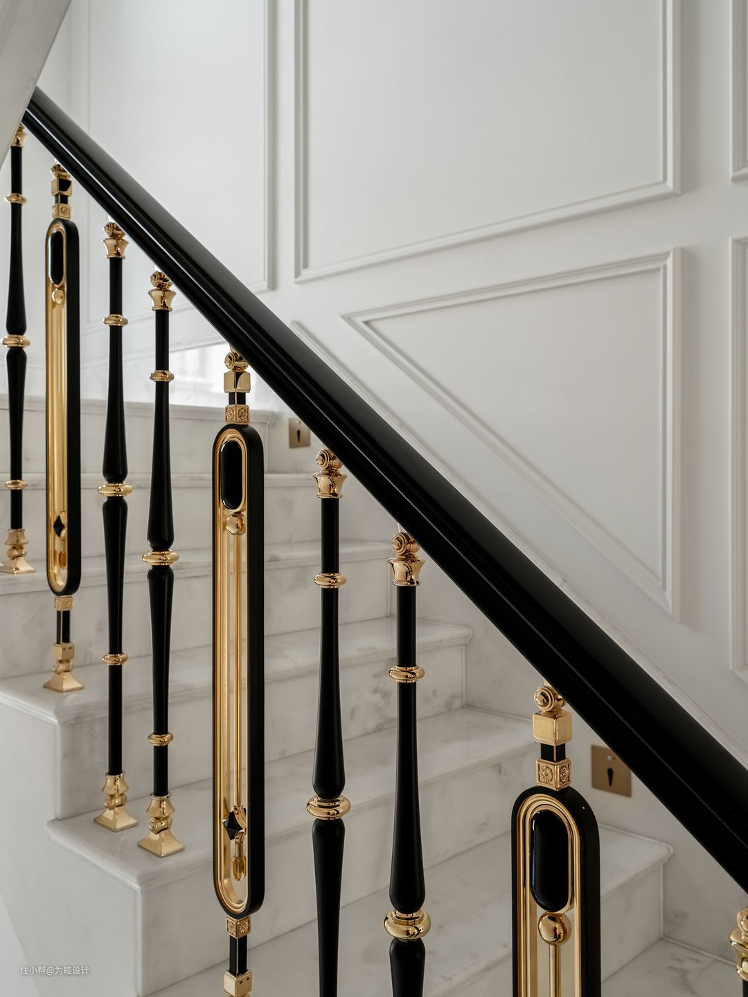 挑高的空间创造开阔的格局,引入充足的自然光,形成美妙的光影,带给居者舒适美好的空间体验。依托挑高的开阔视野,二楼走廊的悬挑露台成为了空间的视觉焦点。露台处于空间核心位置,以流畅优美的弧线打破常规,吸引着人的目光,诠释法式典雅的美学渊源。