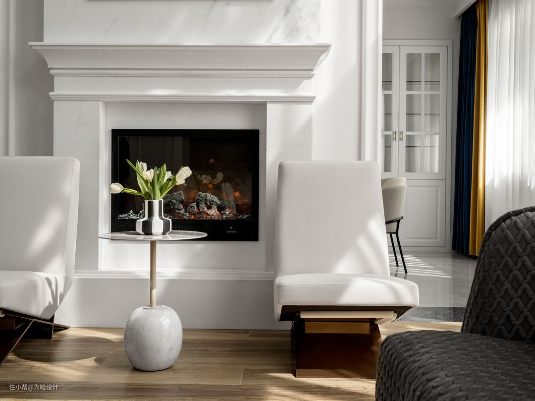 纯净的一隅成为画布,光影游走其上,随时间推移变幻,留下一幅生动的时间画作。纯白的色调剥去繁杂,壁炉渲染出家的舒适放松,坐在安静舒适的空间里,感受时光缓慢的脚步。