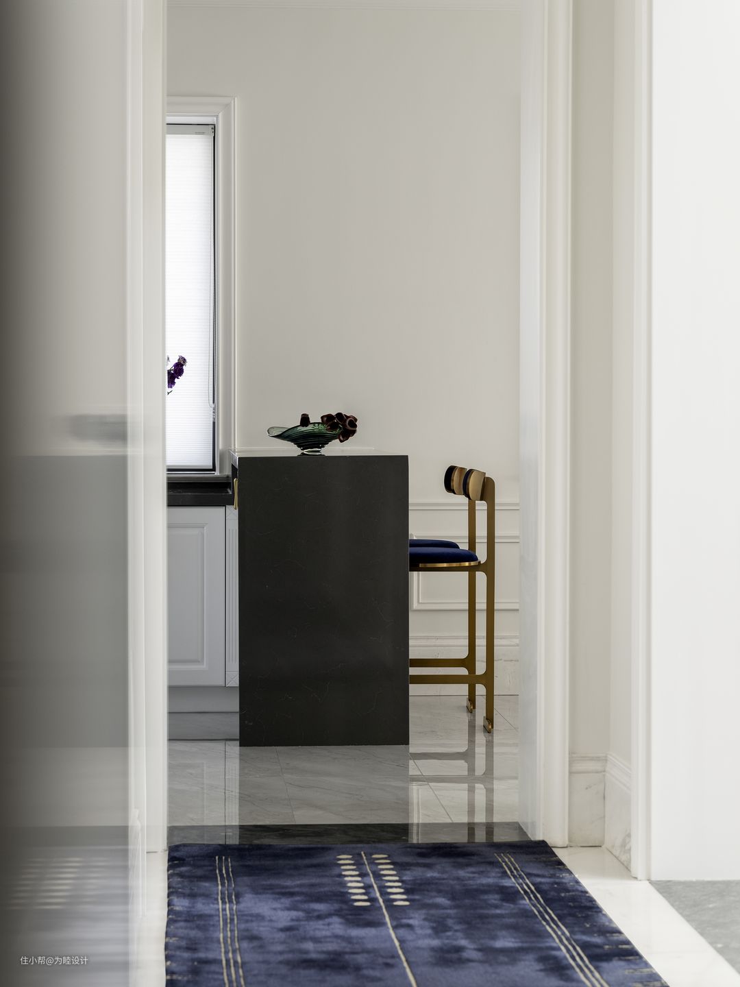 双通道设计打开空间的格局,连通客厅与餐厅,形成流畅便捷的动线。从不同角度看过去,空间格局均成中正对称的形态,赋予空间庄重的仪式感。走廊地毯由设计团队设计,更符合空间气质,为新家创造独一无二的归属感。