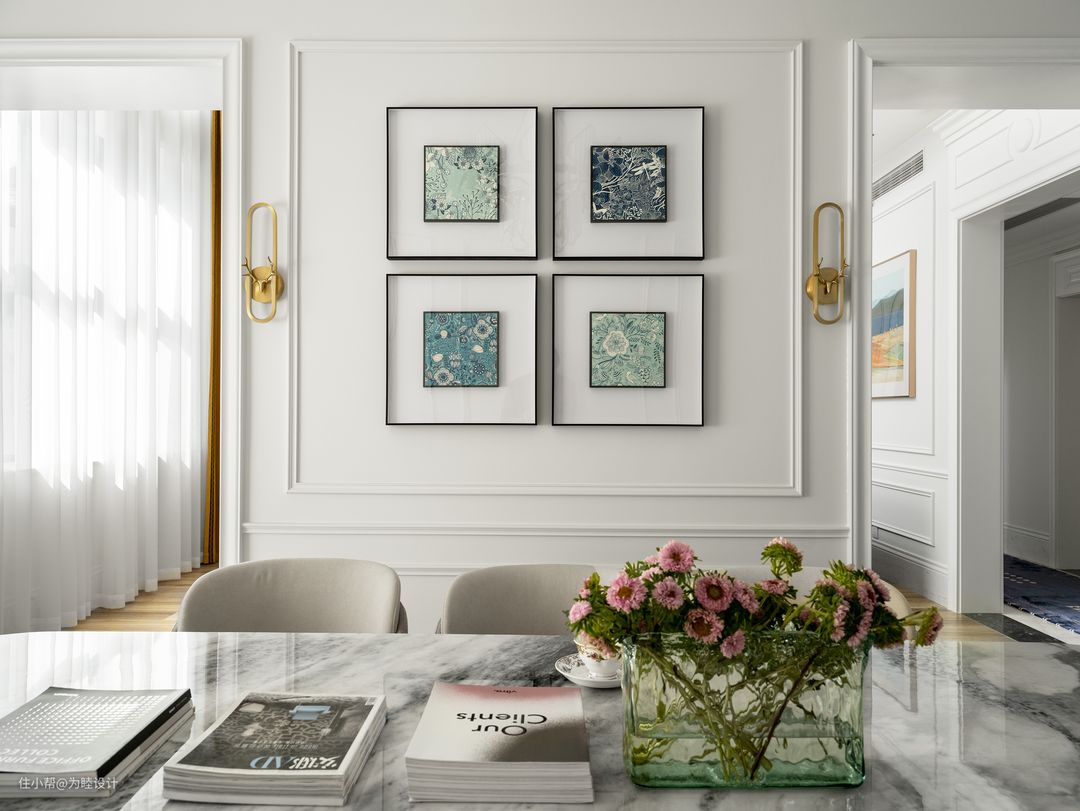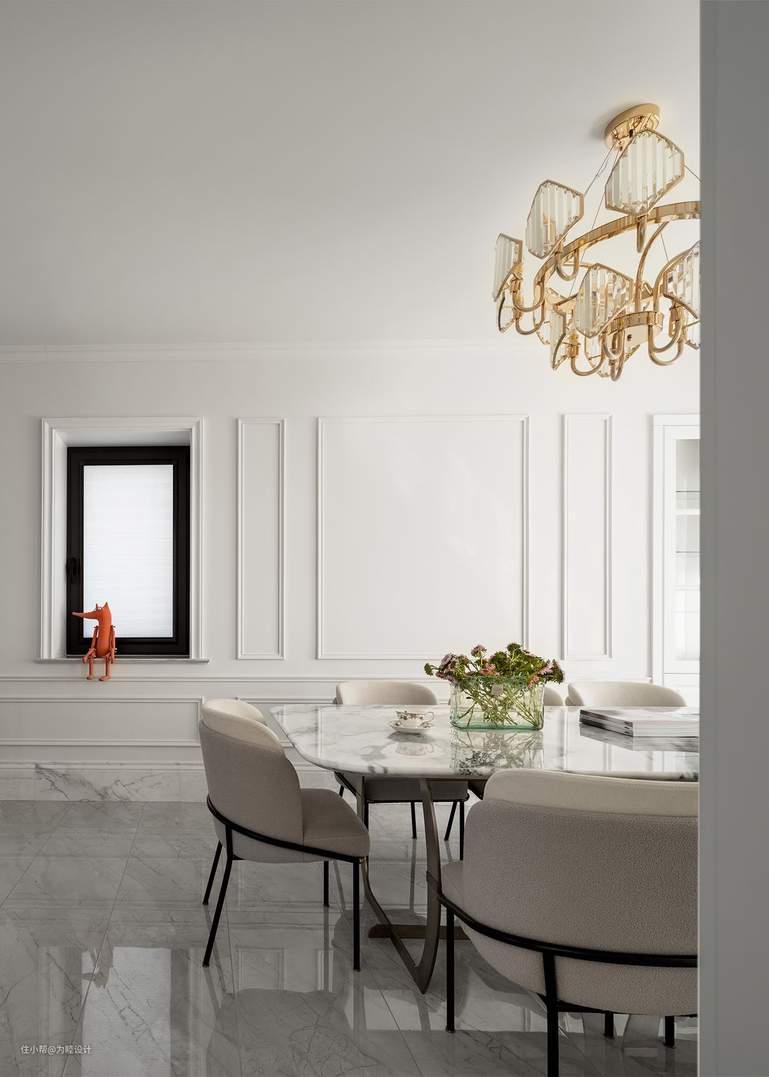 餐厅的色调温柔而优雅,布艺和木饰面从触感强化优雅气质,并平添舒适的体验。纤细的线条,金属与大理石的运用,彰显骨子里的精致格调。