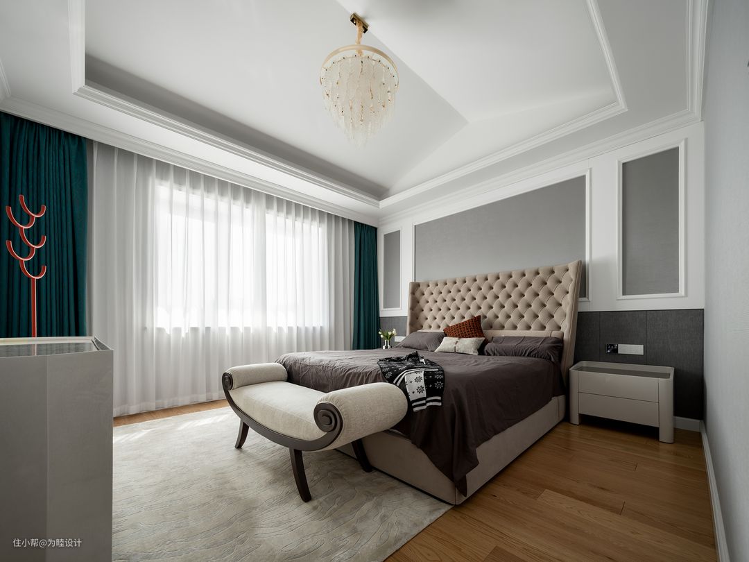 卧室的舒适来自人对空间的全方位感知。尖顶的天花设计以线条的汇聚拉伸着空间和视线,塑造开阔的空间体验;色彩在浓淡之间达成平衡和谐,低调舒缓而不缺乏鲜活气息。