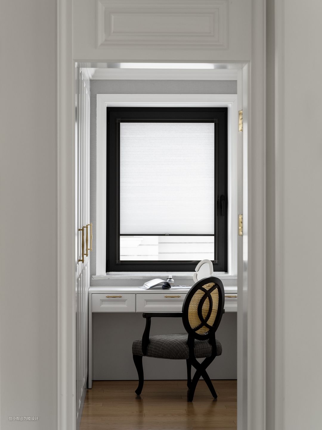 空间原有的梁柱被修饰得整齐划一,细腻的几何线条排列出井井有条的序列,简约而精致,充实着空间,将法式优雅浪漫的情愫浸染在细节里。