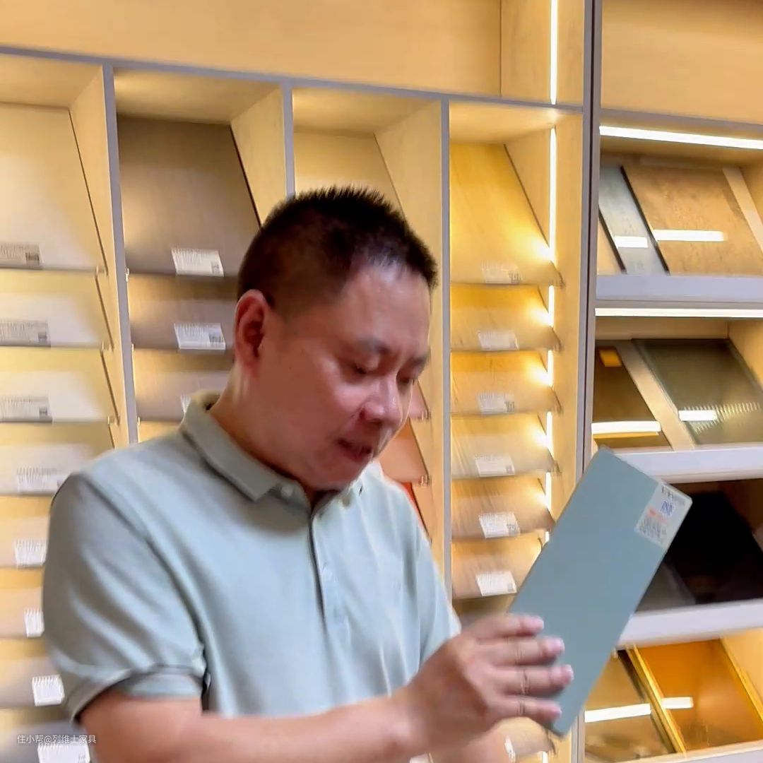 就像我手里的板材,两面都是肤感的,可以选择实木、多层板、禾香板或颗粒板等不同的基材,根据预算选择。