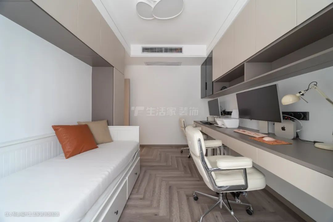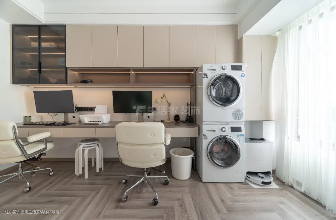 因客户夫妻都是摄影师,他们需要独立的安静的办公环境,设计师设计时根据业主的需求,考虑到要劳逸结合,也因空间有限,设计师打造了集办公、休闲娱乐、洗衣房功能为一体的三用空间,将空间利用率最大化的同时,也让业主的生活更便利舒适。