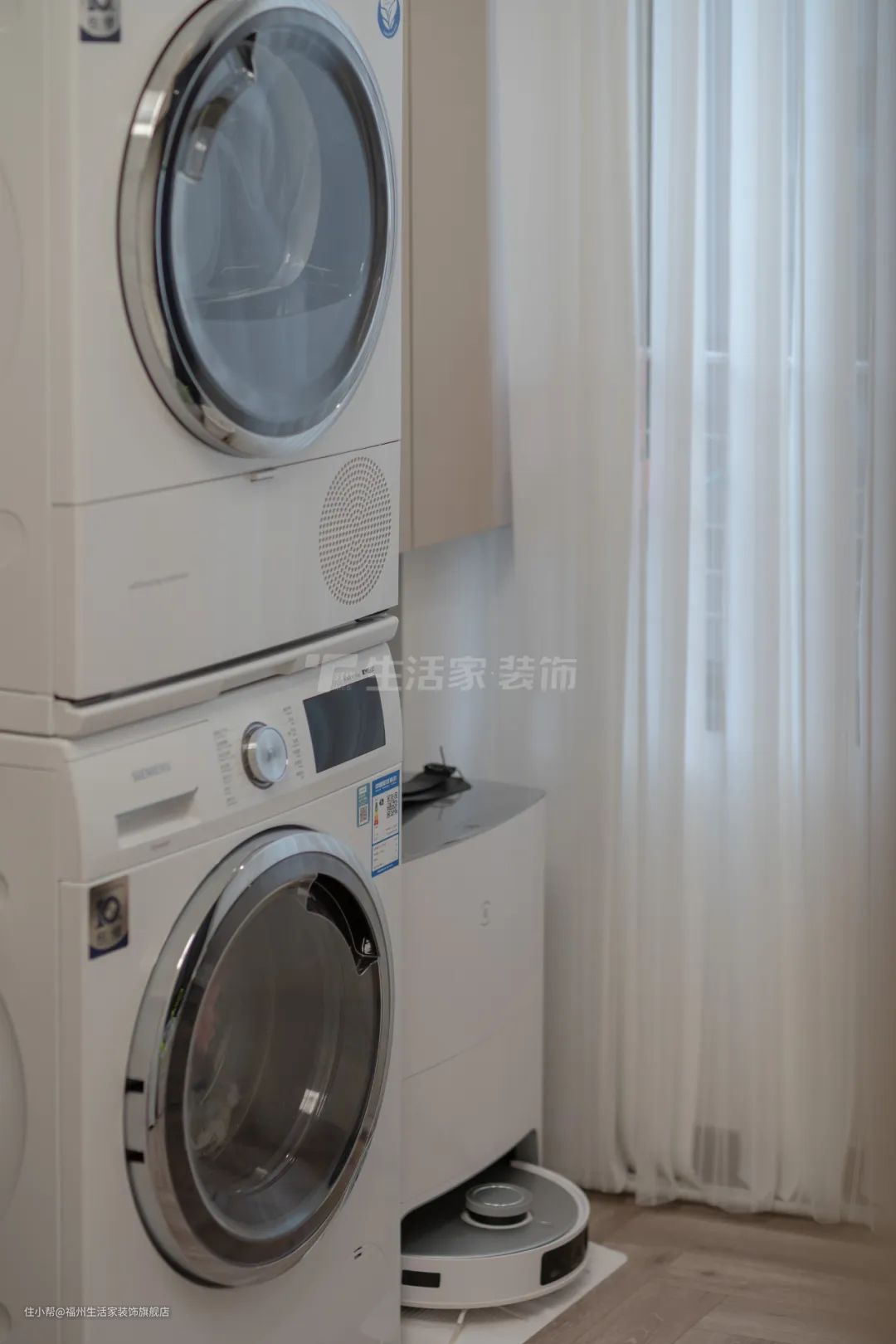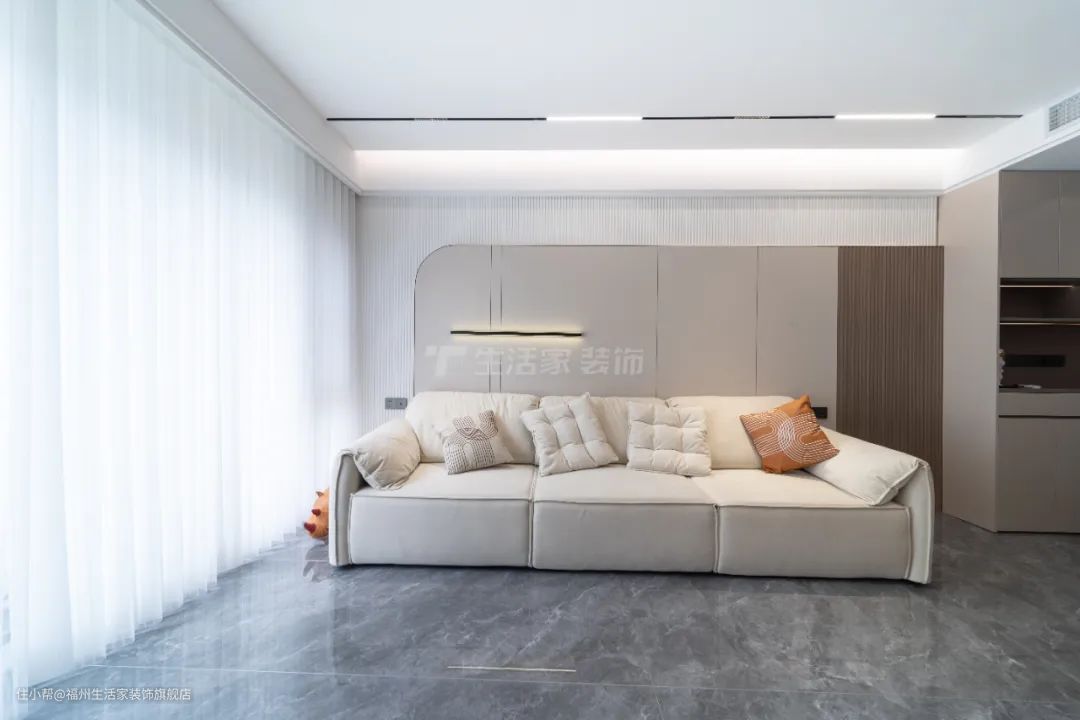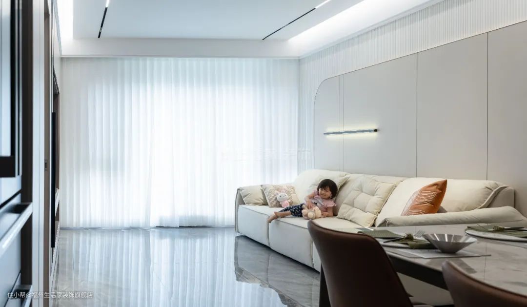 设计师在设计方面,①保持客餐厅一体不隔断,空间开阔舒适;②把阳台打通封成落地窗,采光变好,显得客厅通透又精致;③家庭洗衣房+书房,一屋两用,将空间利用率最大化。