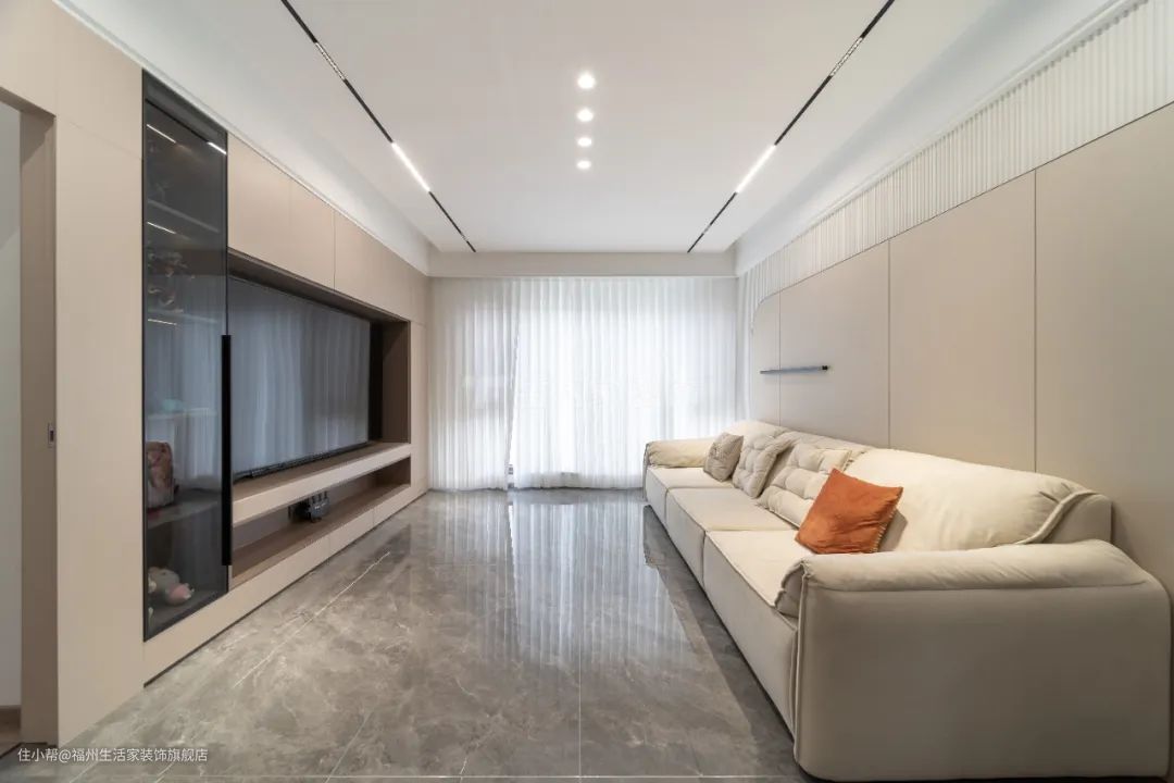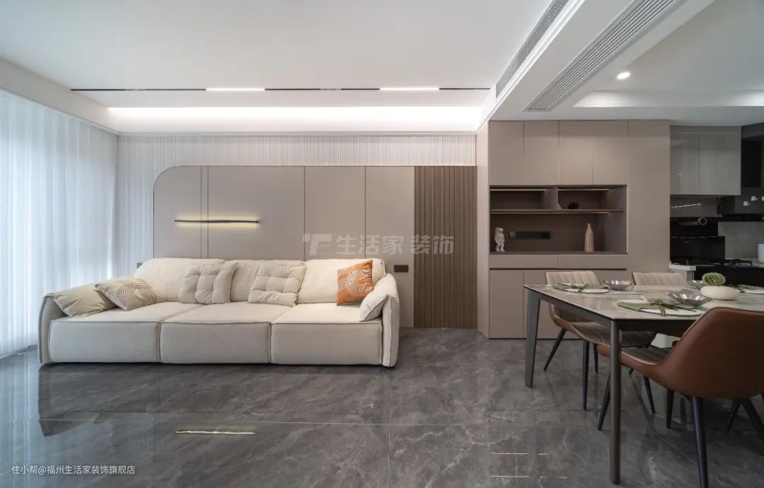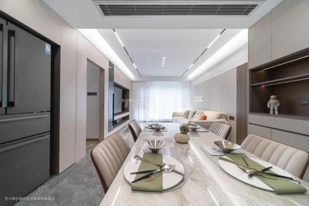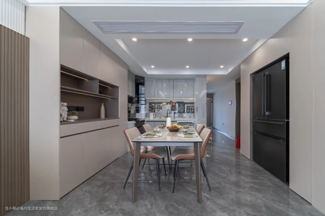 整个客餐厅减法设计,做双眼皮吊顶不积灰;提前开好轨道灯槽,磁吸灯后期内嵌,搭配无主灯增加空间层次感;全屋通铺瓷砖整体性强,空间开阔通透,更和谐美观,营造出高级,独具品味的氛围感。