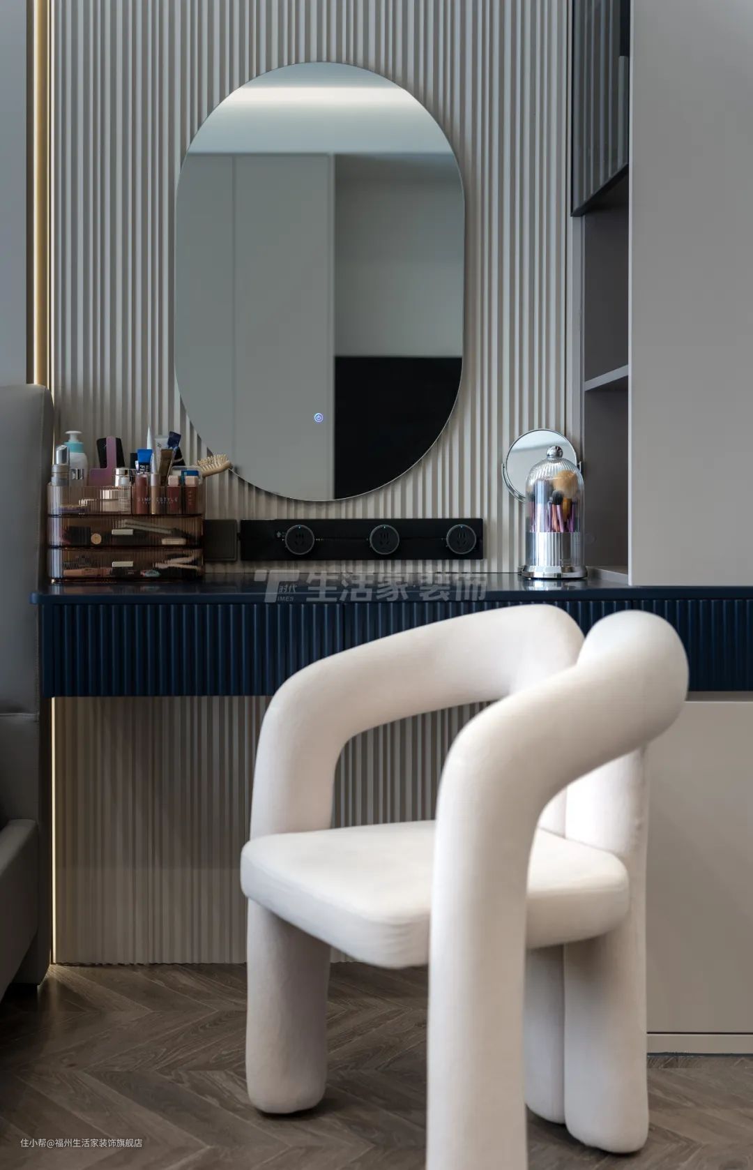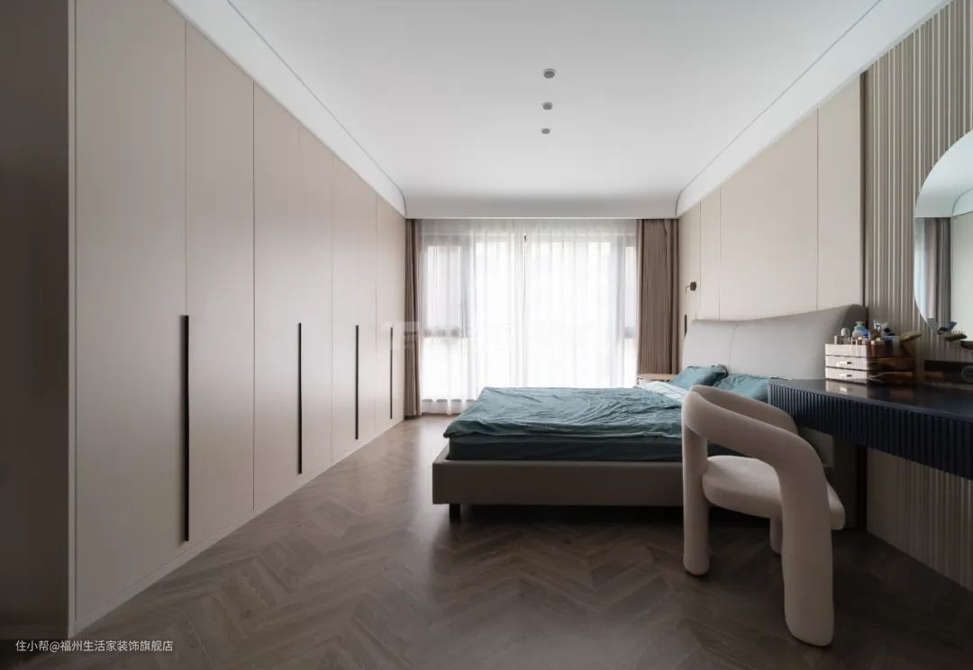 根据女主人的需求,主卧内设置了衣帽间,以满足日常生活的需求也增加了收纳空间。卧室整体采用灰白色系的定制柜,选用按压式门板、肤感面板,视觉效果显得柔和温馨。搭配多功能床头柜、创意感十足的床头灯及梳妆椅,让空间更显时尚的同时,也让生活更舒适。