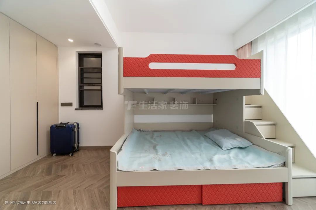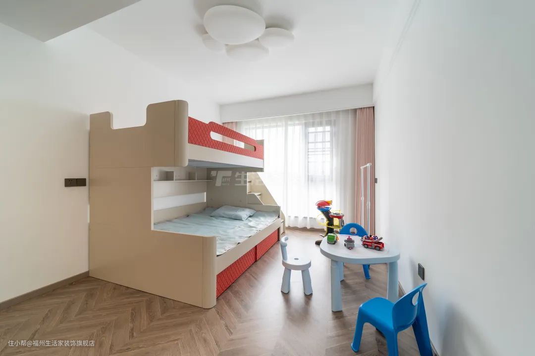 因为业主的孩子并不大,设计师考虑到以后空间的成长性及多元性,并未对儿童房进行过多的设计,仅仅是满足日常的收纳需求,所以整个空间显得有点过于空旷,但这恰恰满足了现阶段孩子的需求,让他们有一个独立的空间可以尽情的玩耍吵闹。