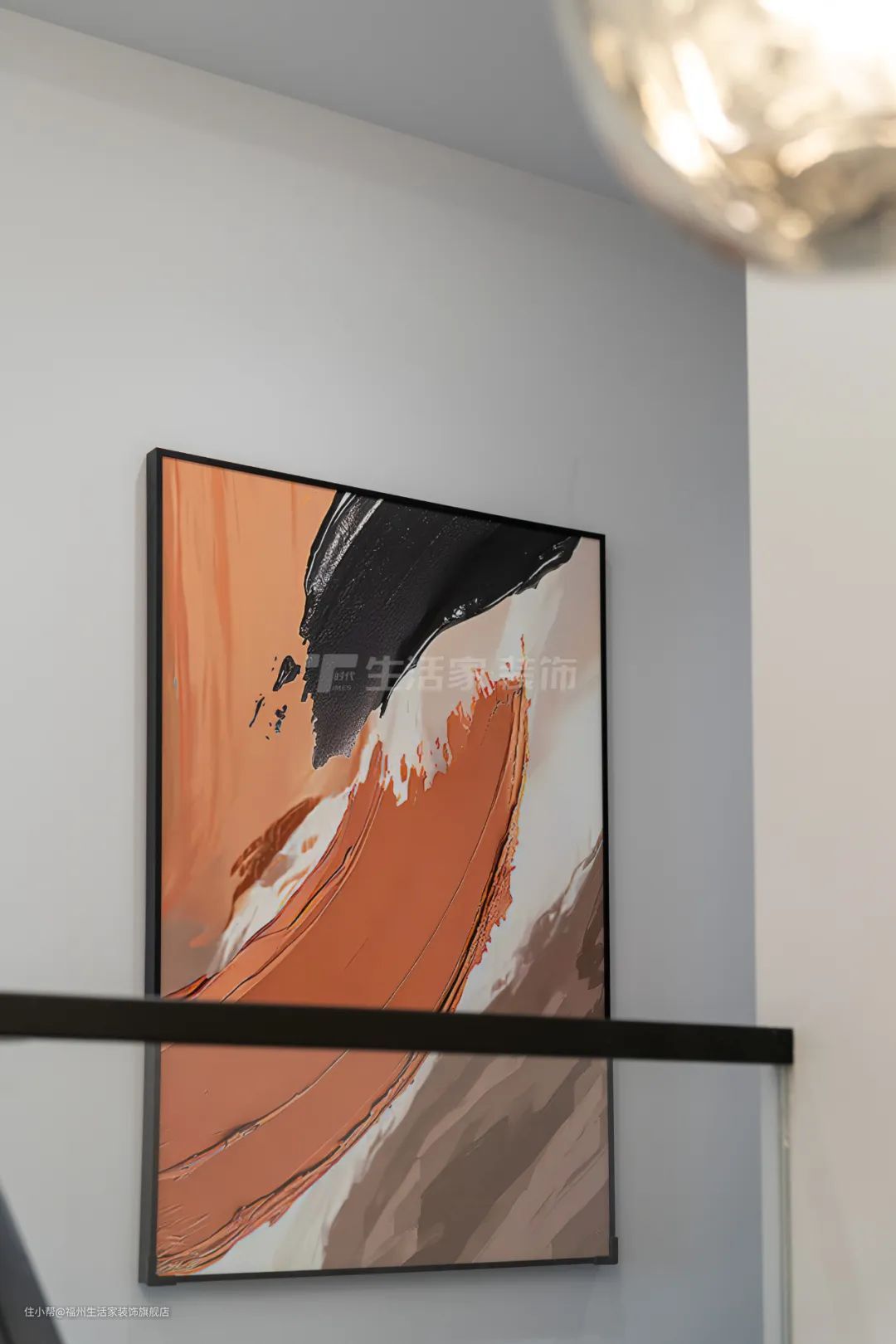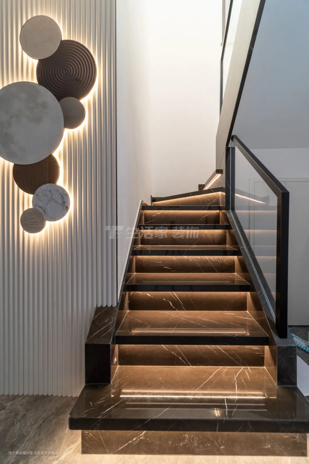 设计师采用黑色石材踏步、黑色不锈钢扶手、灰白色格栅、氛围灯及装饰画,虽然上楼的时间很短,但也要好好的装点空间,给生活一点仪式感,让生活更美好。