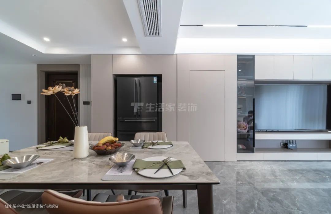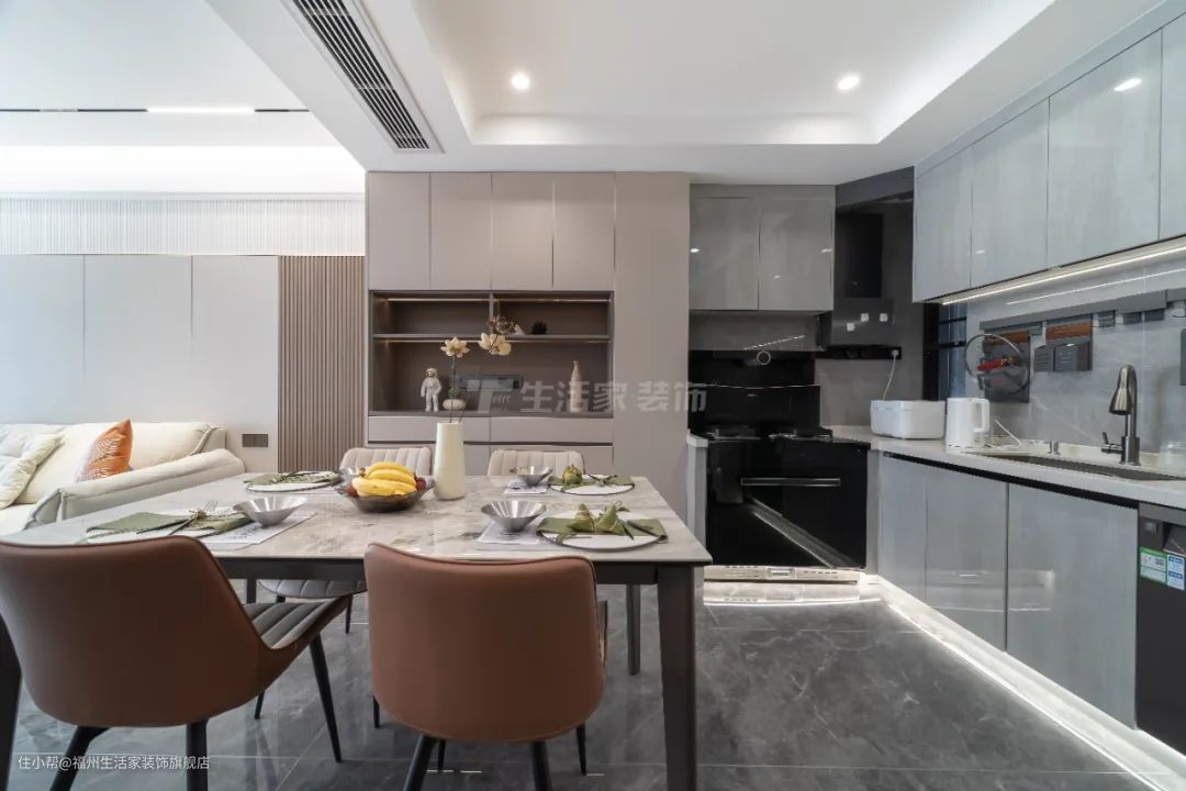 打造开放式厨房,将客餐厨连为一体,增加空间延展性及开阔性的同时,也让在烹饪美食的人可随时与客餐厅的人保持互动,既忙碌又温馨,还可享受难得的亲子时光。