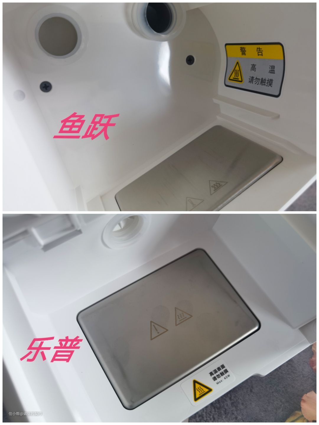 水箱底部湿化板取下来明显能够看到乐普的要比鱼跃的大一圈。同样的功率和温度,接触面越大升温越快,乐普的加热效率肯定要高一些。