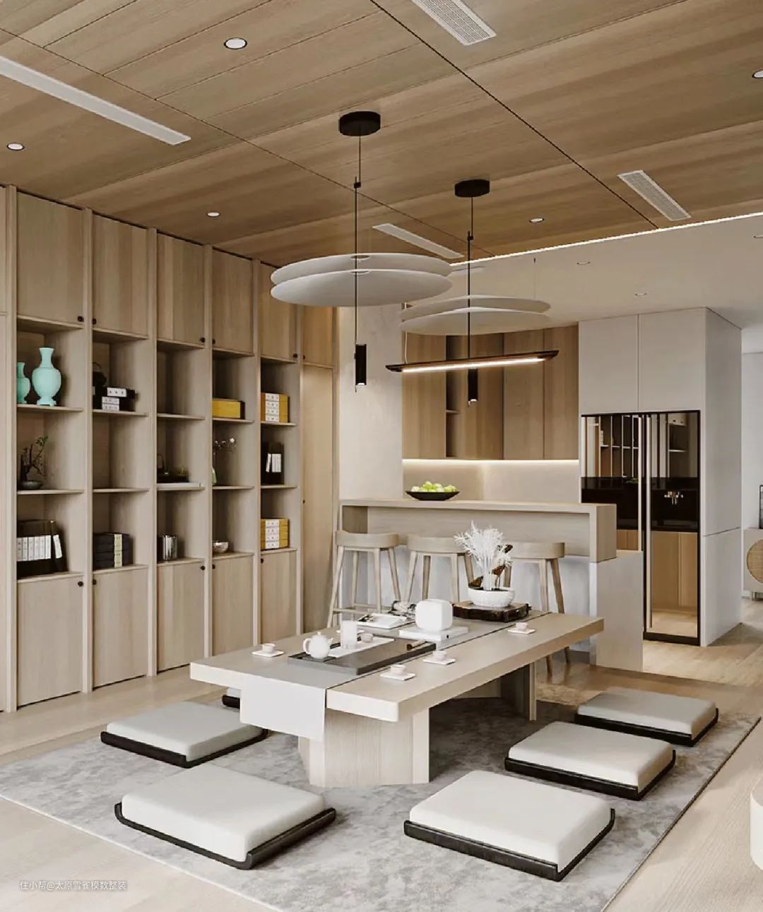 去客厅化的设计主要去的功能就是常规的会客功能,在这样的设计下会客方式会发生改变,可能是席地而坐,或者坐在一起像开会,需要我们提前考虑好实际情况。