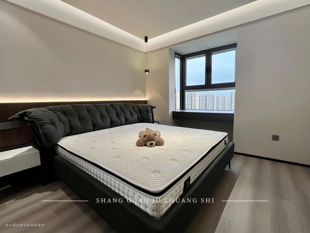 卧室整体采用高级灰与深咖色碰撞,客厅相呼应,飘窗改为悬浮桌,不仅美观还增加了实用性,有一旁放置单人椅,可以放松的同时,也可以阅读。