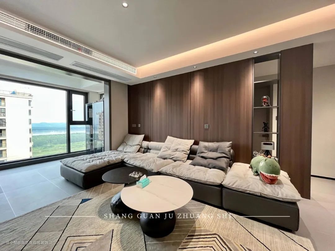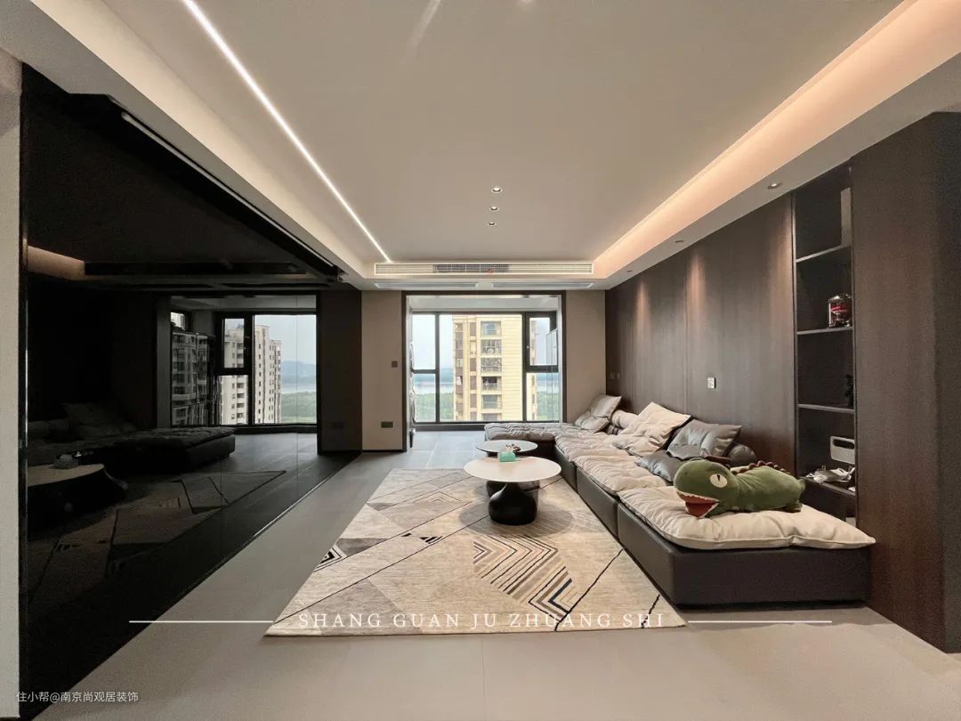 沙发背景墙的设计采用桃木色的木饰面,开放区域可以置放收藏品、手办。对面墙体则采用了整面纯黑色玻璃加投影仪的设计,体现出屋主的品味!
