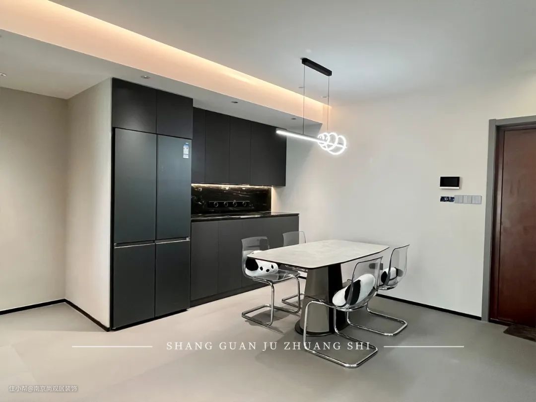 橱柜门做无把手设计,外观极简高级,整体色调与客餐厅一致,视觉效果更加整洁。