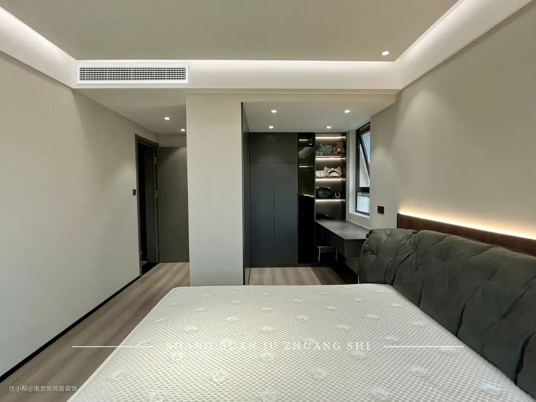 无主灯设计加上隐藏灯带,明暗交错,打造静谧雅致氛围。房间左侧设计为衣帽间,能满足主人日常衣物收纳。