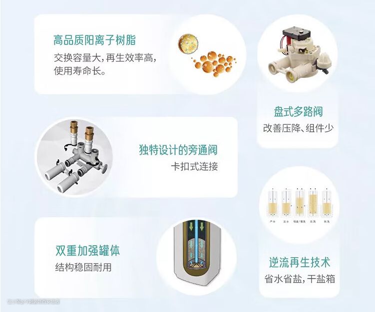 其他分支的产品,例如置过滤器、中央净水机、末端净水机,它们本质上都是在起过滤净化的作用,只是选用的滤网或滤芯精度不同。而软水机是基于完全不同的原理在工作,核心是离子交换。