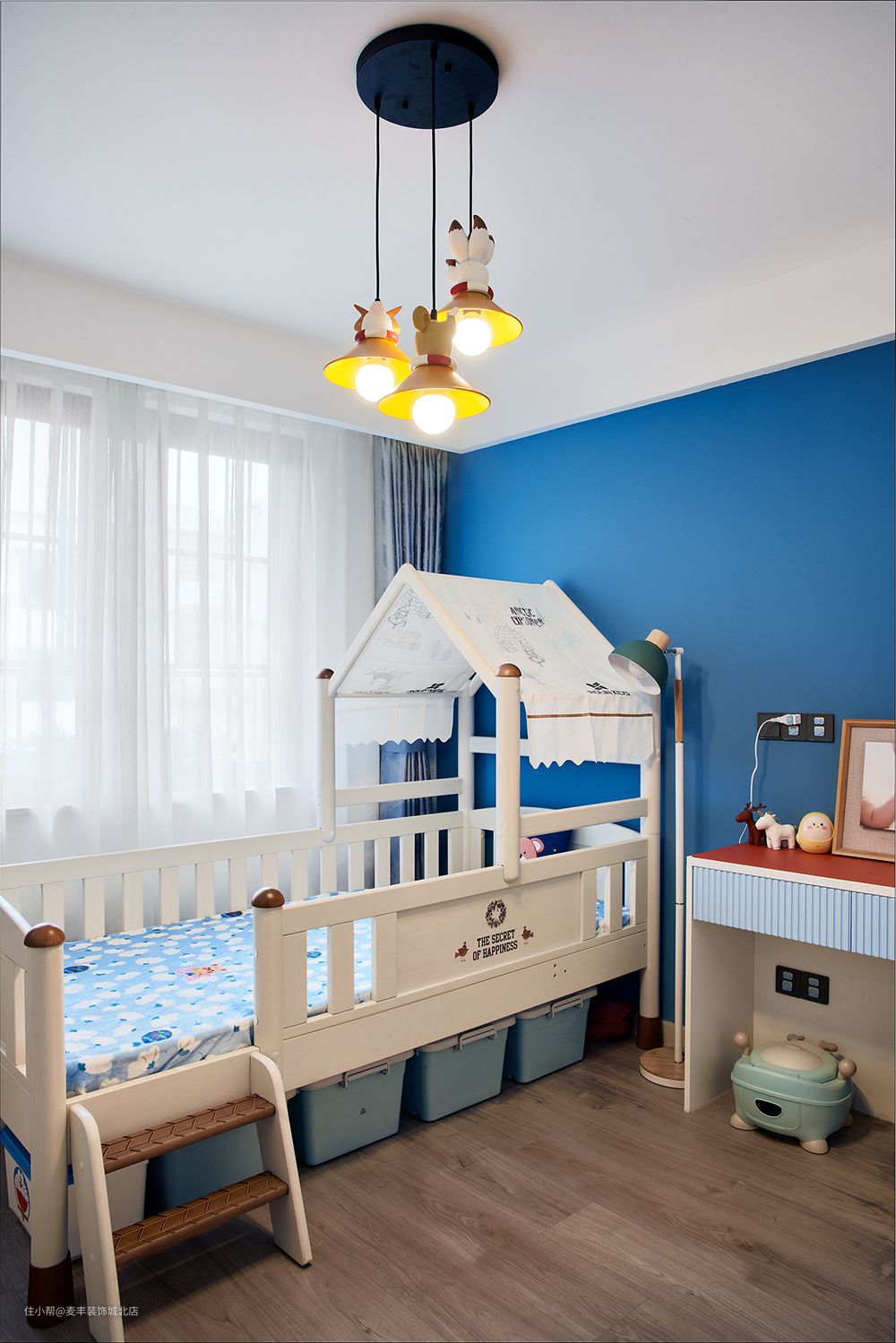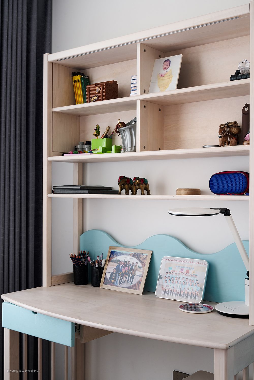 儿童房里的书桌也是必备单品之一,作为孩子可支配的小角落,可用来完成作业,看看课外书,也可当作涂鸦的画台,将一闪而过的奇思妙想给保存下来。