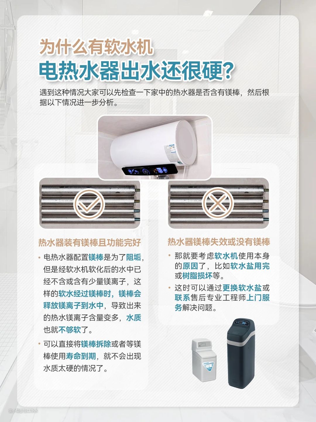 电热水器配置镁棒是为了阻垢,但是经软水机软化后的水中已经不含或含有少量镁离子。这样的软水经过镁棒时,镁棒会释放镁离子到水中,导致出来的热水镁离子含量变多,水质不够软!