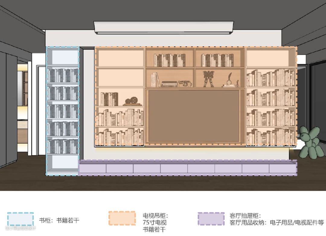 电视墙储物柜结构展示,根据小朋友身高定制的隔层高度,伸手就可拿取阅读。而最下方的一排抽屉,则是用来收纳小朋友玩具,并可从小培养孩子自主收纳的好习惯。