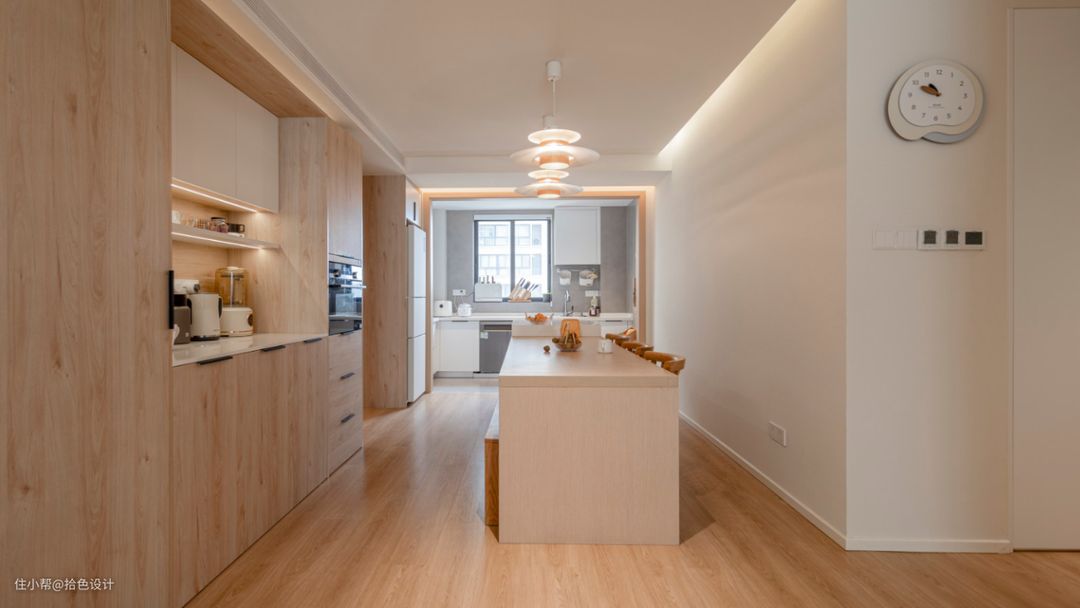 厨房虽说做了开放式设计,但也预留了移门轨道,方便后期根据需求安装移门。不过结合屋主半年的居住体验来看,似乎也并不需要移门隔断。