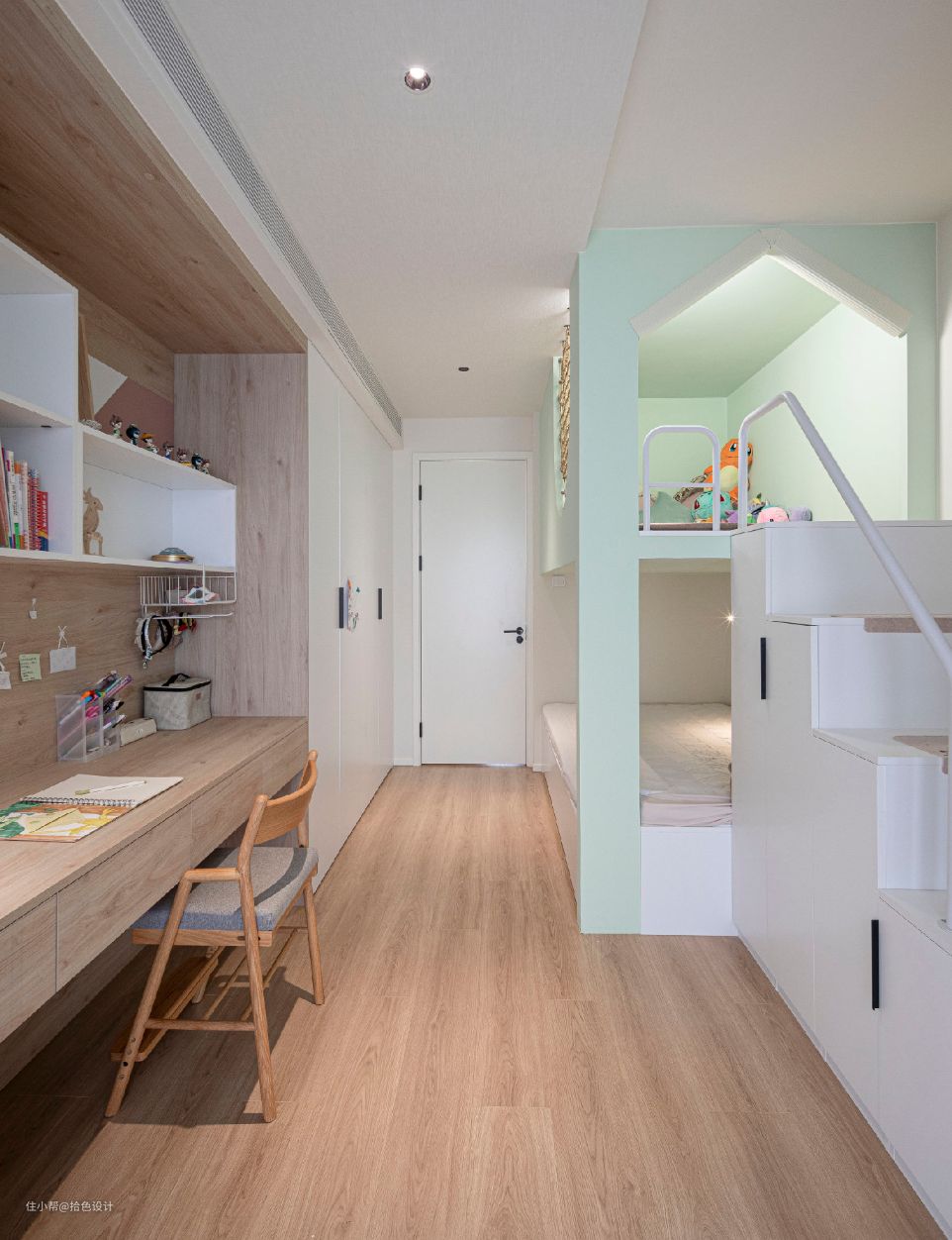 儿童房集合了学习区、储物区、睡眠区、玩耍区等多个功能,并通过对称式的布局方式,增强了空间的整体感与秩序感。