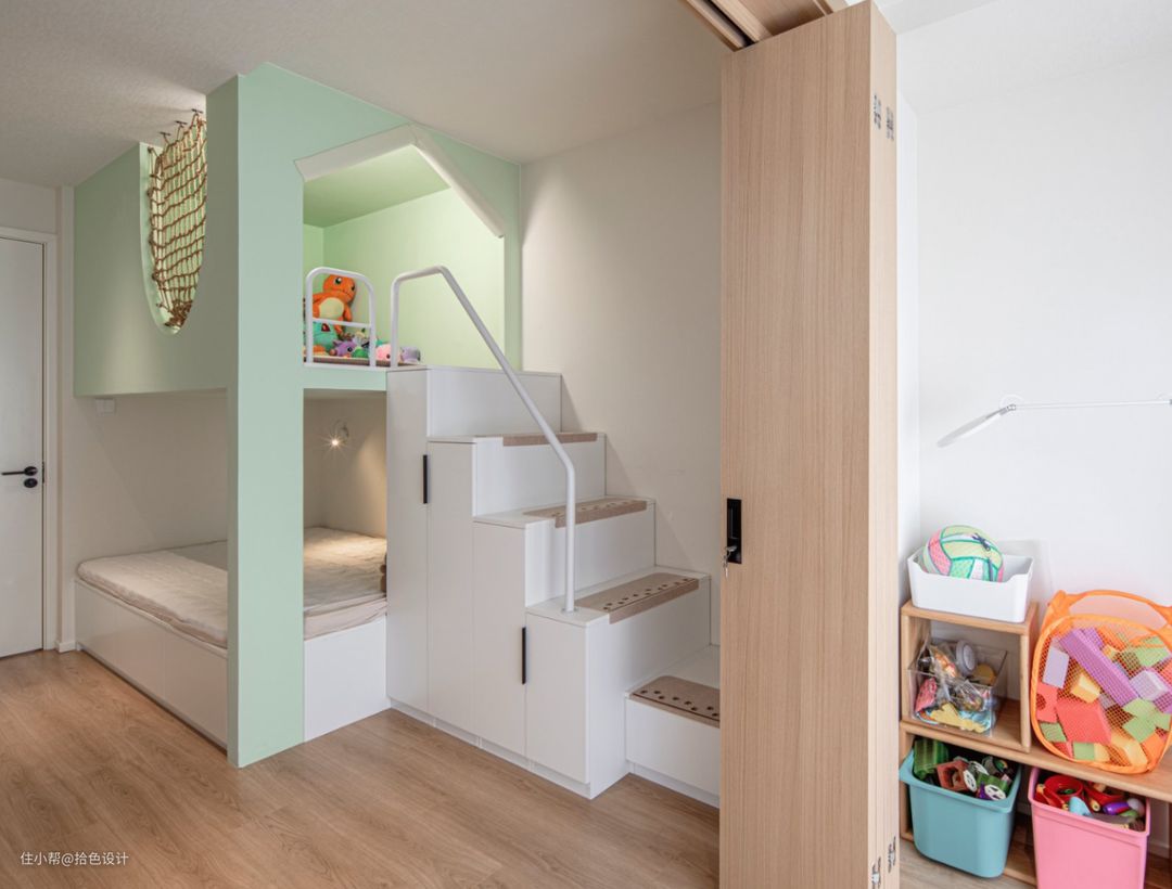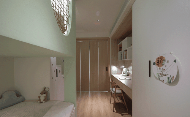 重新规划的儿童房,利用折叠门与阳台进行了分隔。一来让空间做到了互不干扰,二来与其它空间串联起了一条洄游动线,让孩子可以在家里自由穿梭奔跑。