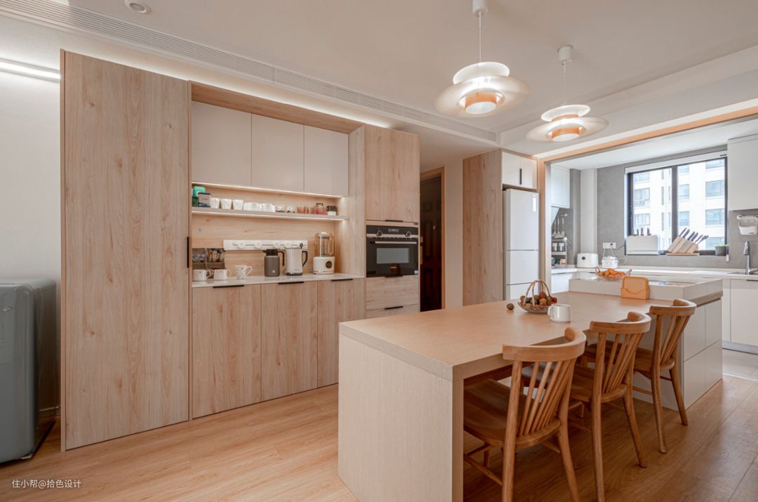 通过玄关就是餐厅,一体式的中岛+餐桌组合,巧妙地让空间实现了洄游动线,并且增强了空间的功能性与互动性,使其成为一块情感交流区。而当厨房打开之后,整个空间也真正做到了贯通、大气。