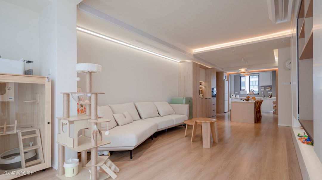 沙发墙留白,再搭配定制尺寸的沙发,简洁又舒适。同时,顶面暗藏的灯光,还一定程度上提升了空间的氛围感。