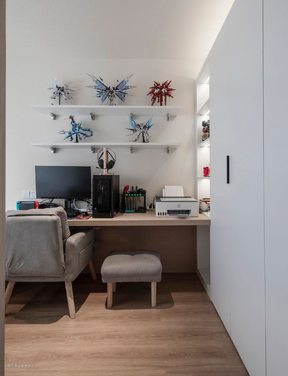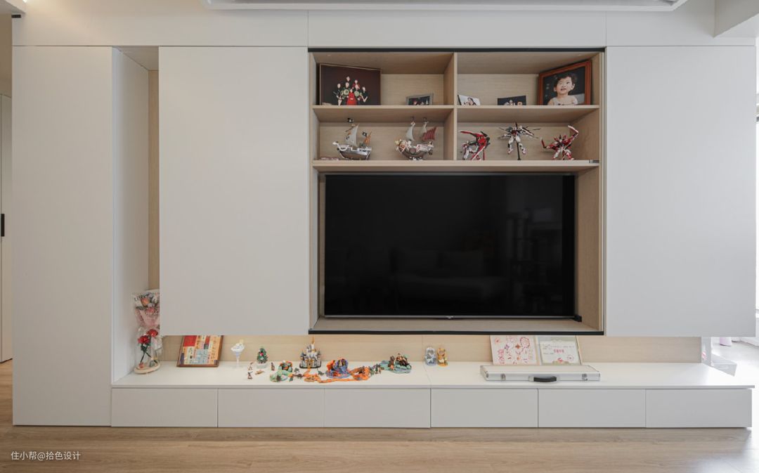 榻榻米暗藏升降桌,无论是闲时拼手办,还是喝茶放松,都极为惬意。当然,大量的储物柜设计,也再一次提升了家里的收纳力。