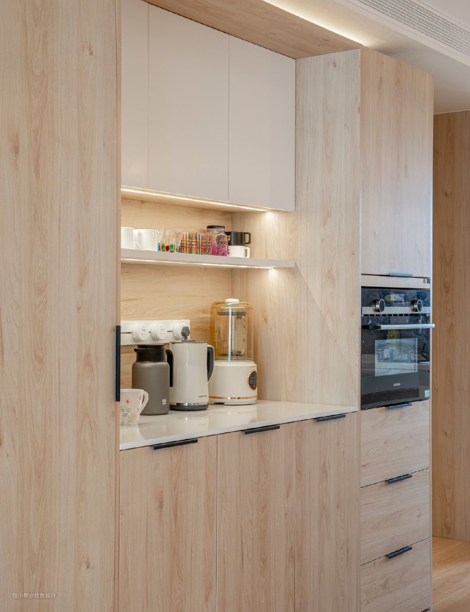 餐边柜预留水吧台,以及内嵌蒸烤一体箱,进一步延伸了厨房的功能性。无论是煮一壶咖啡,还是制作简单的烘焙,都可以得到满足,让生活更加高效有品质。