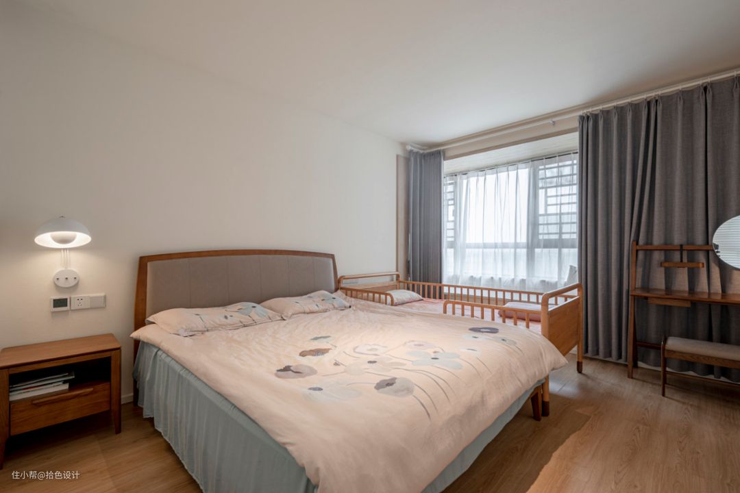 来到主卧,整体延续了外面的简洁,并通过原木家具,以及部分深色元素,平衡了空间基调,让睡眠环境更加安宁。