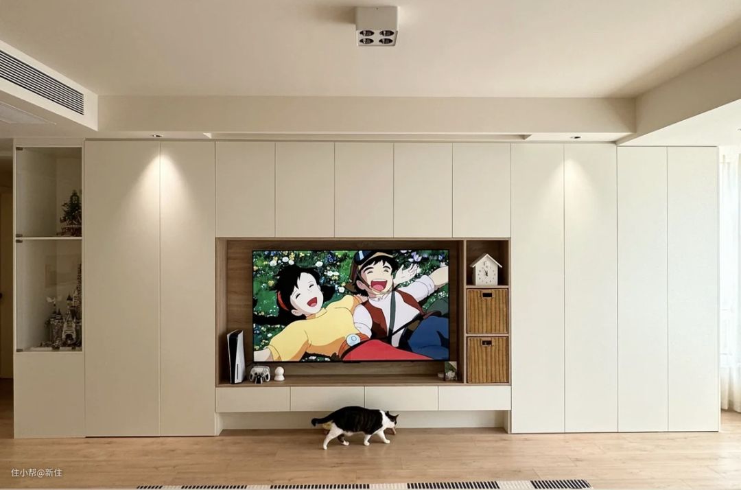 就是给原本电视墙的那一面,全部打成柜子,中间留出挂电视的位置。