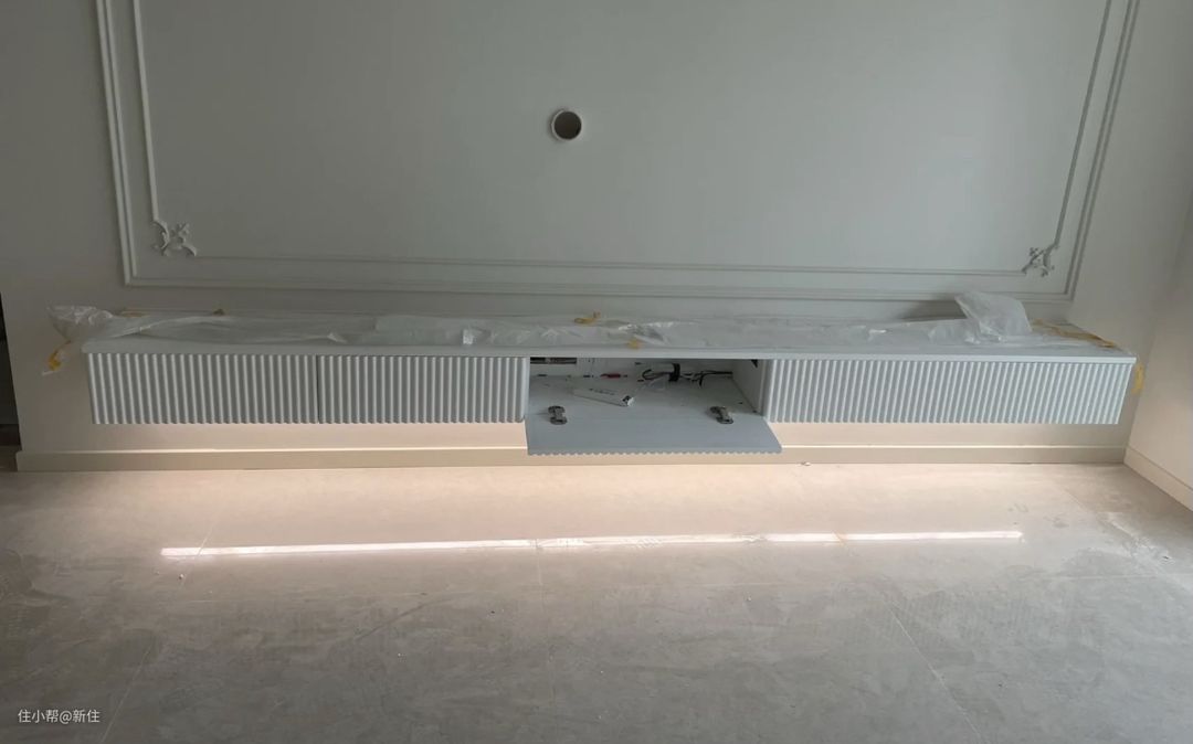 格栅木饰面高,电视柜没办法靠墙这是其一,其二是会留下缝隙,后期都是卫生死角。