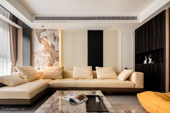 客厅采用大面积米黄色调,给人大气治愈的第一印象,通透的大窗让室内与城市精致融合,通透而灵活,仿佛是一座悬与空中的光之岛,主灯设计简约时尚让普通空间变得高级!